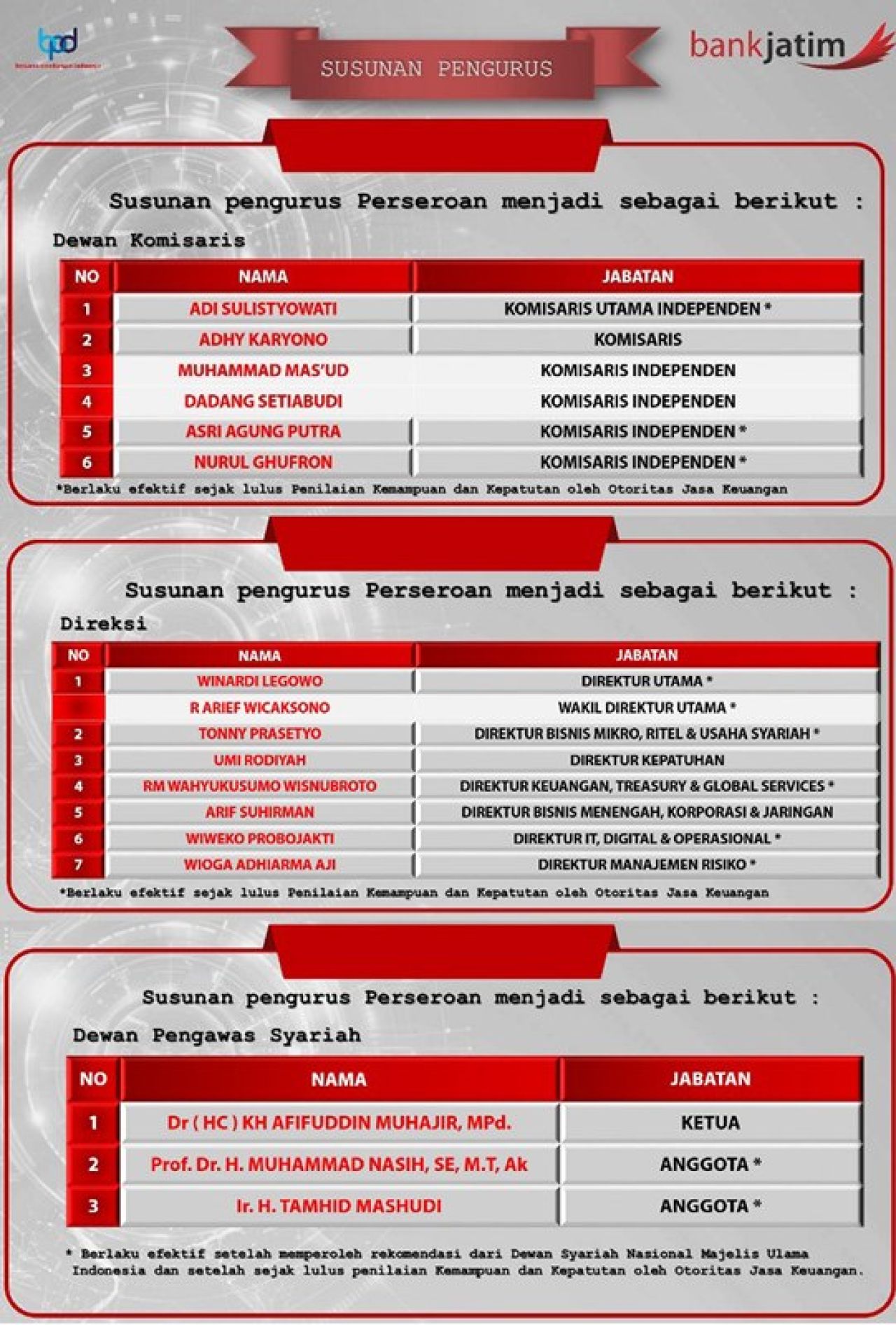 Seluruh calon pejabat yang diusulkan akan mulai menjabat secara resmi setelah memperoleh persetujuan dari regulator. Mereka wajib menjalani uji kelayakan dan kepatutan (fit and proper test) dari Otoritas Jasa Keuangan (OJK).