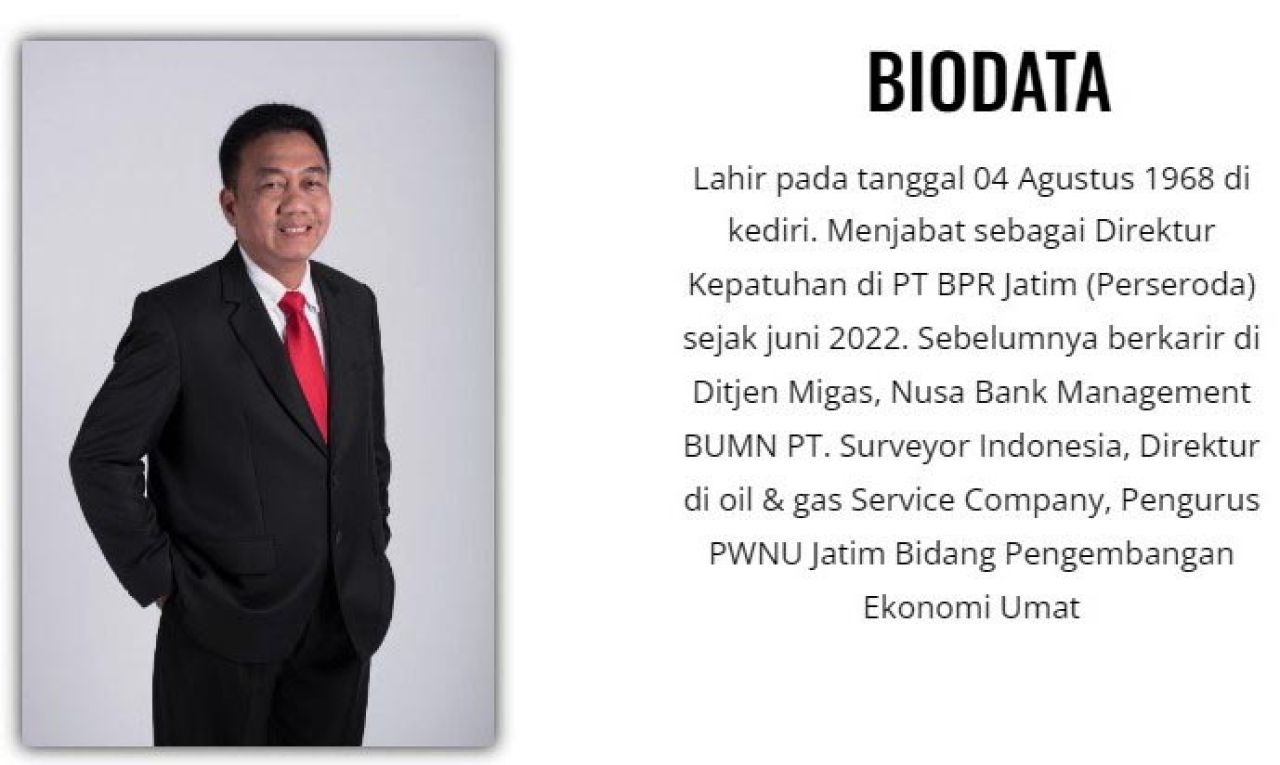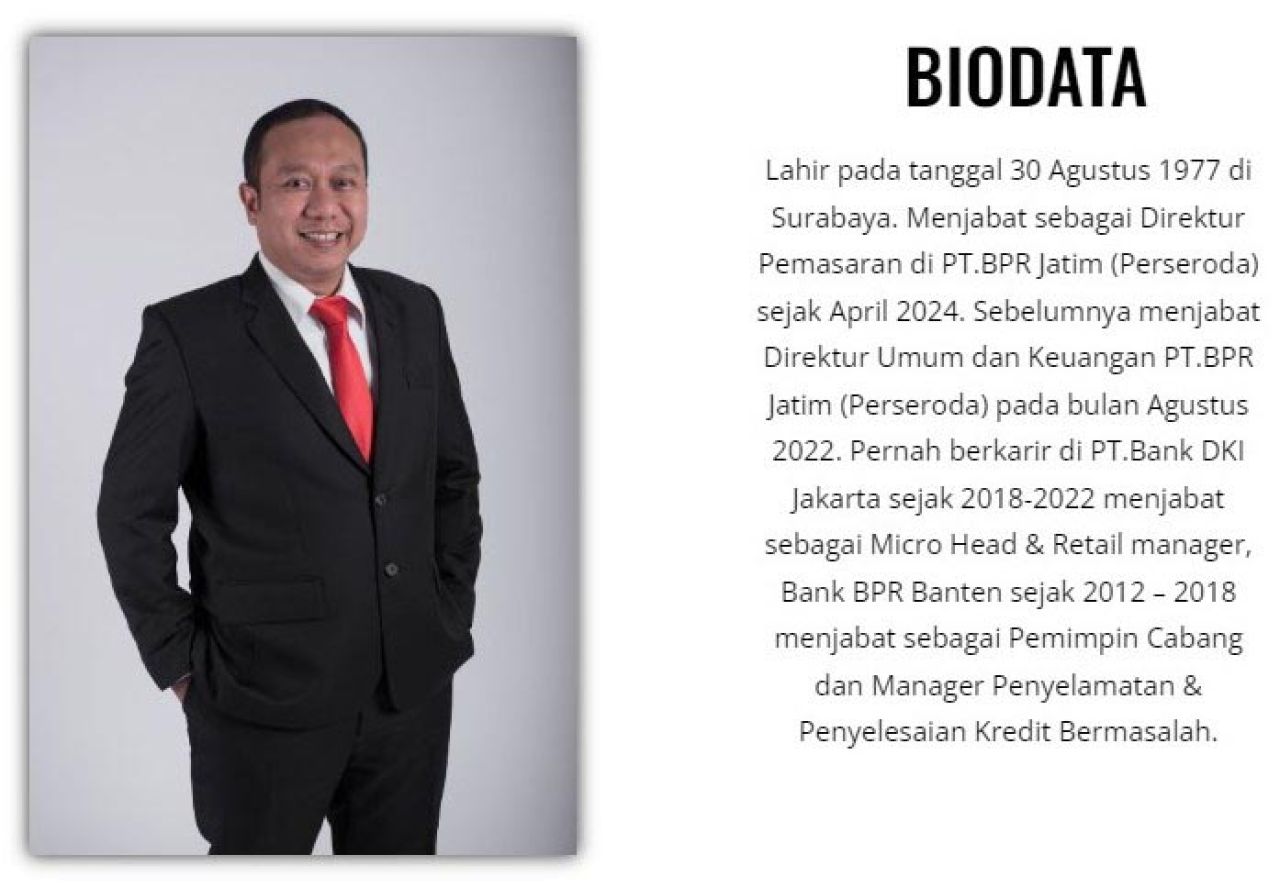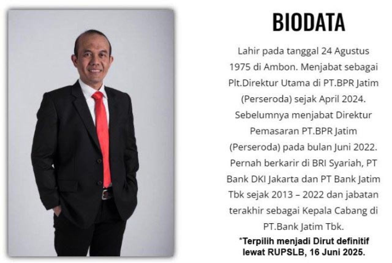 SURABAYA | Barometer Jatim – Irwan Eka Wijaya Arsyad naik pangkat menjadi Direktur Utama (Dirut) definitif PT Bank Perekonomian Rakyat (BPR) Jatim -- salah satu BUMD Pemprov Jatim -- dari posisi Direktur Umum dan Keuangan. Sebelumnya dia ditunjuk sebagai Plt Dirut sejak 23 April 2024.