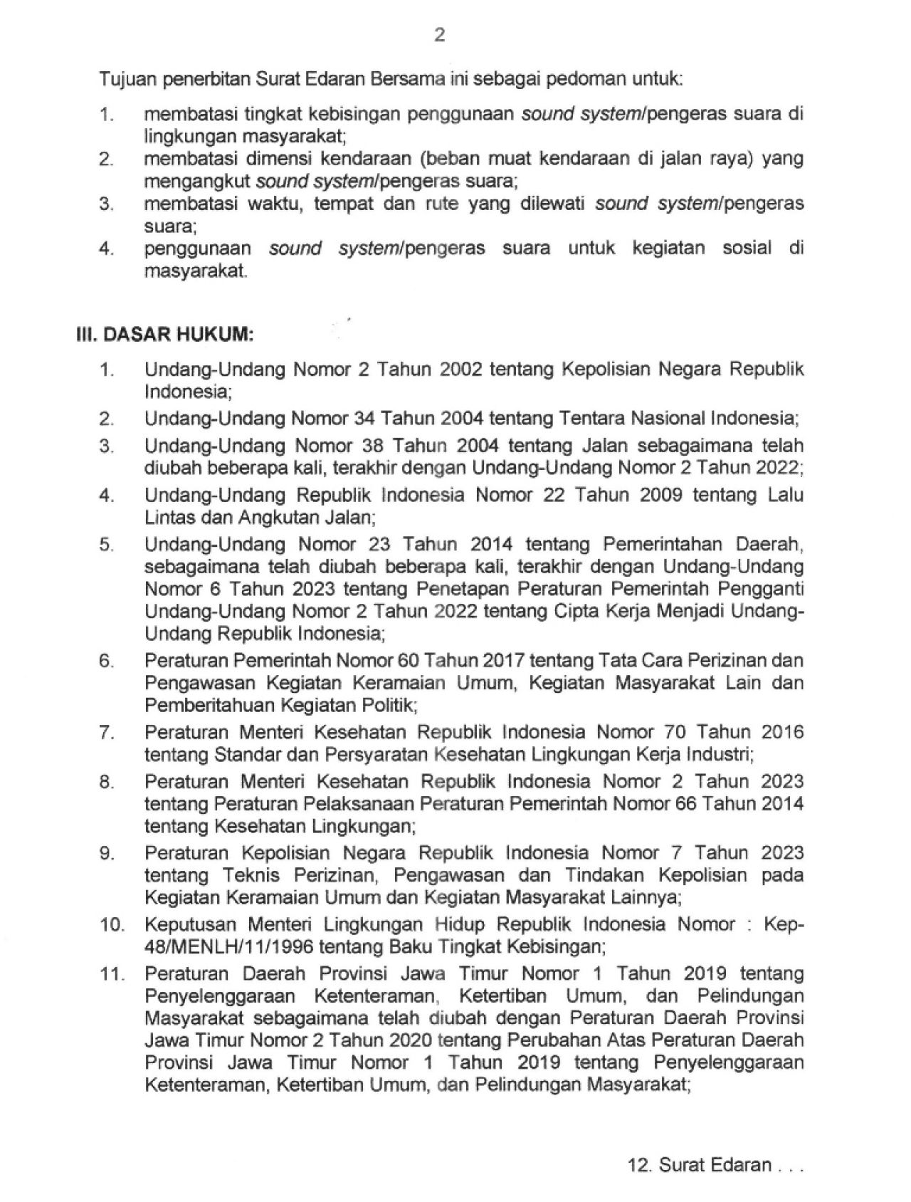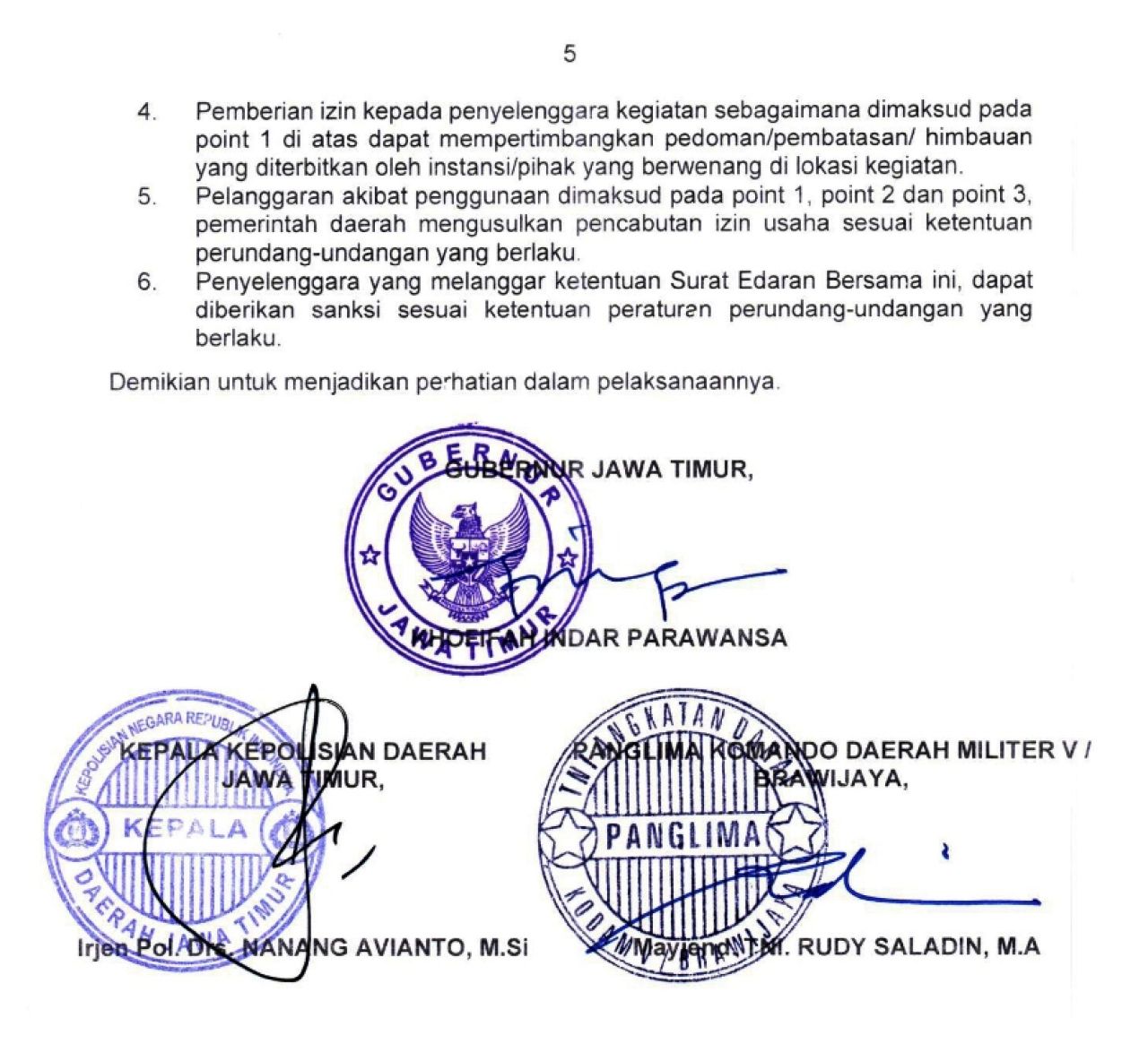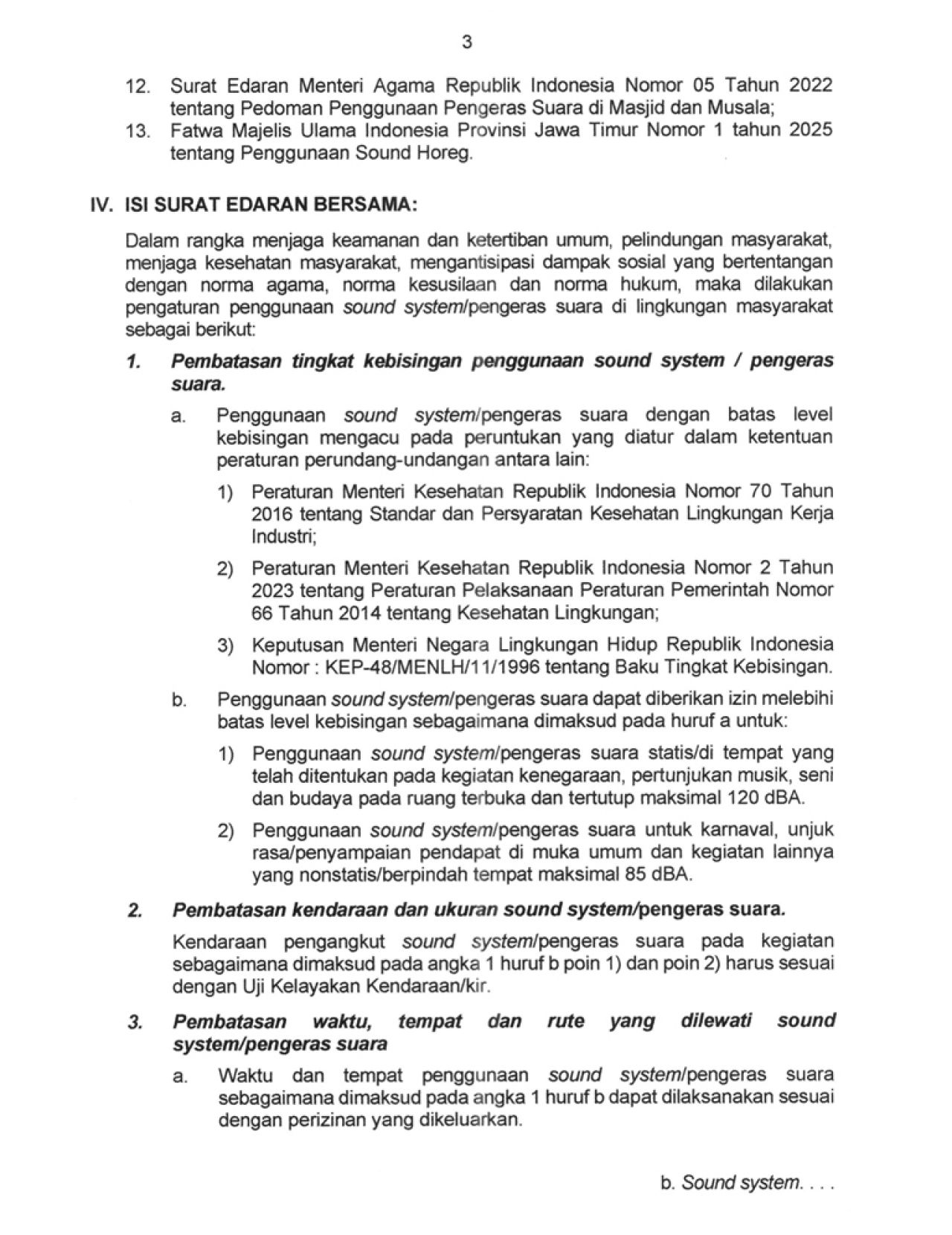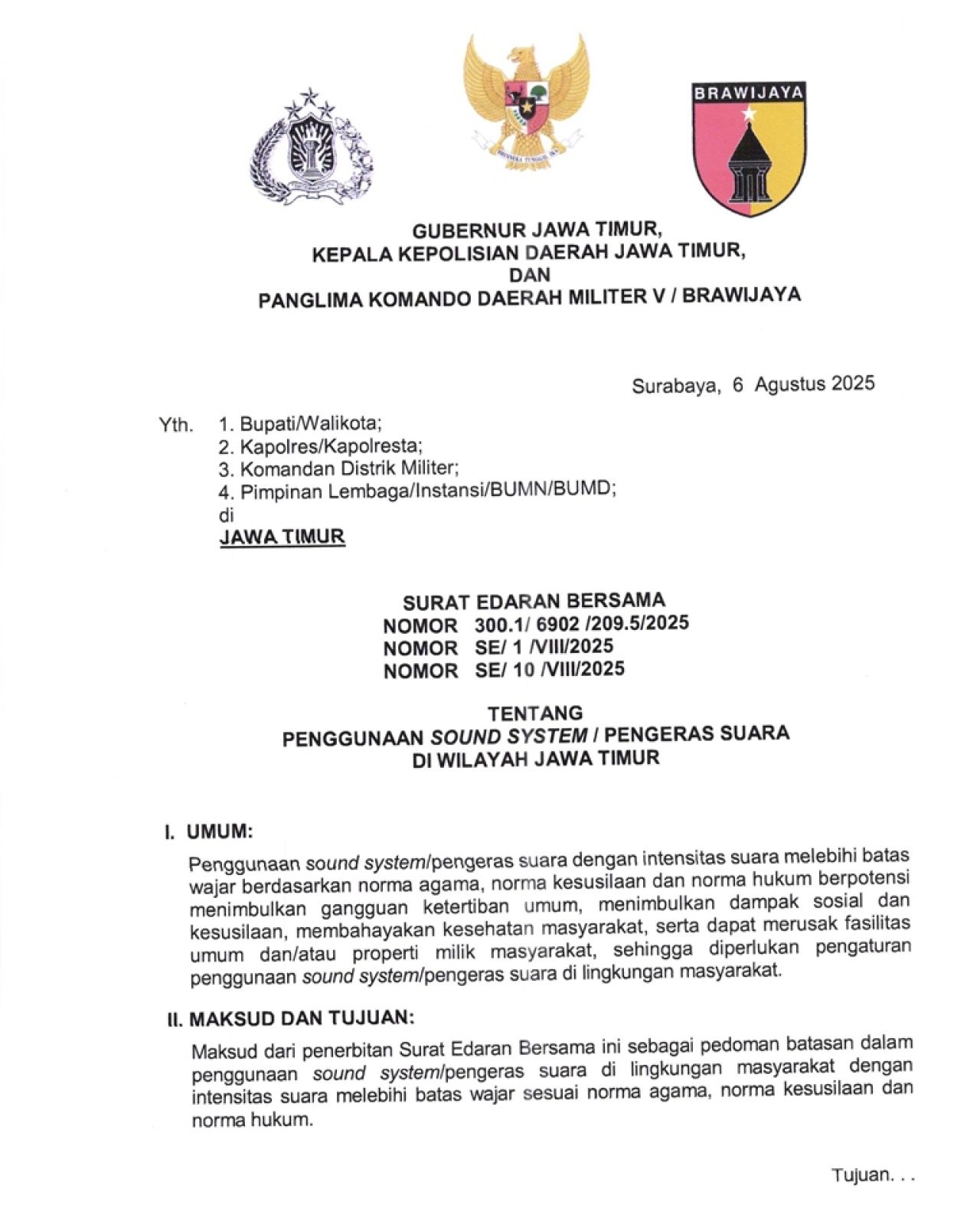 SE ditandatangani Khofifah bersama Kapolda Jatim Irjen Pol Nanang Avianto dan Pangdam V Brawijaya Mayjen TNI Rudy Saladin. Dalam SE disebutkan sound horeg tidak dilarang tapi ada aturan yang harus dipenuhi. Ini bunyi SE selengkapnya: