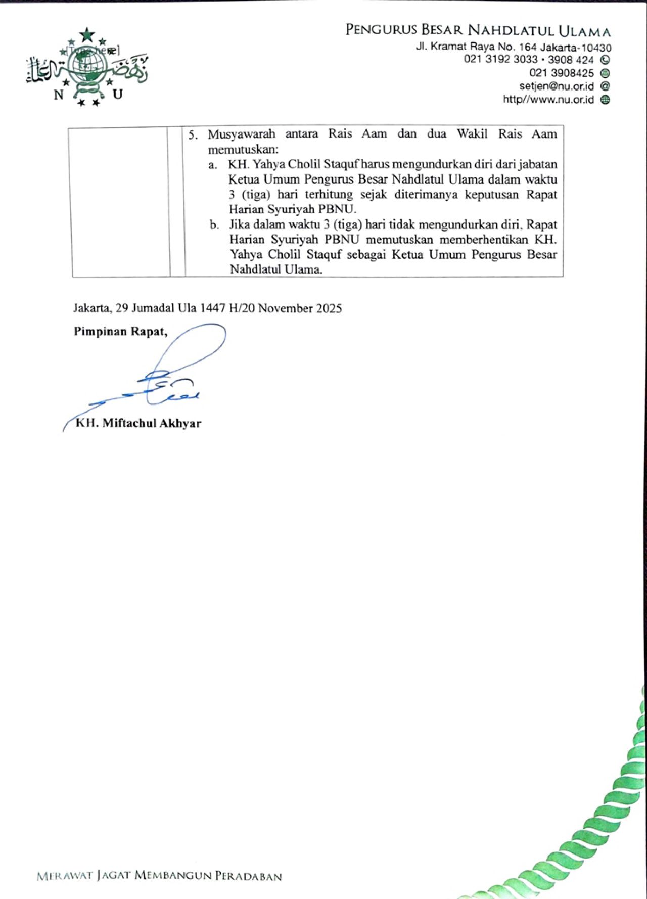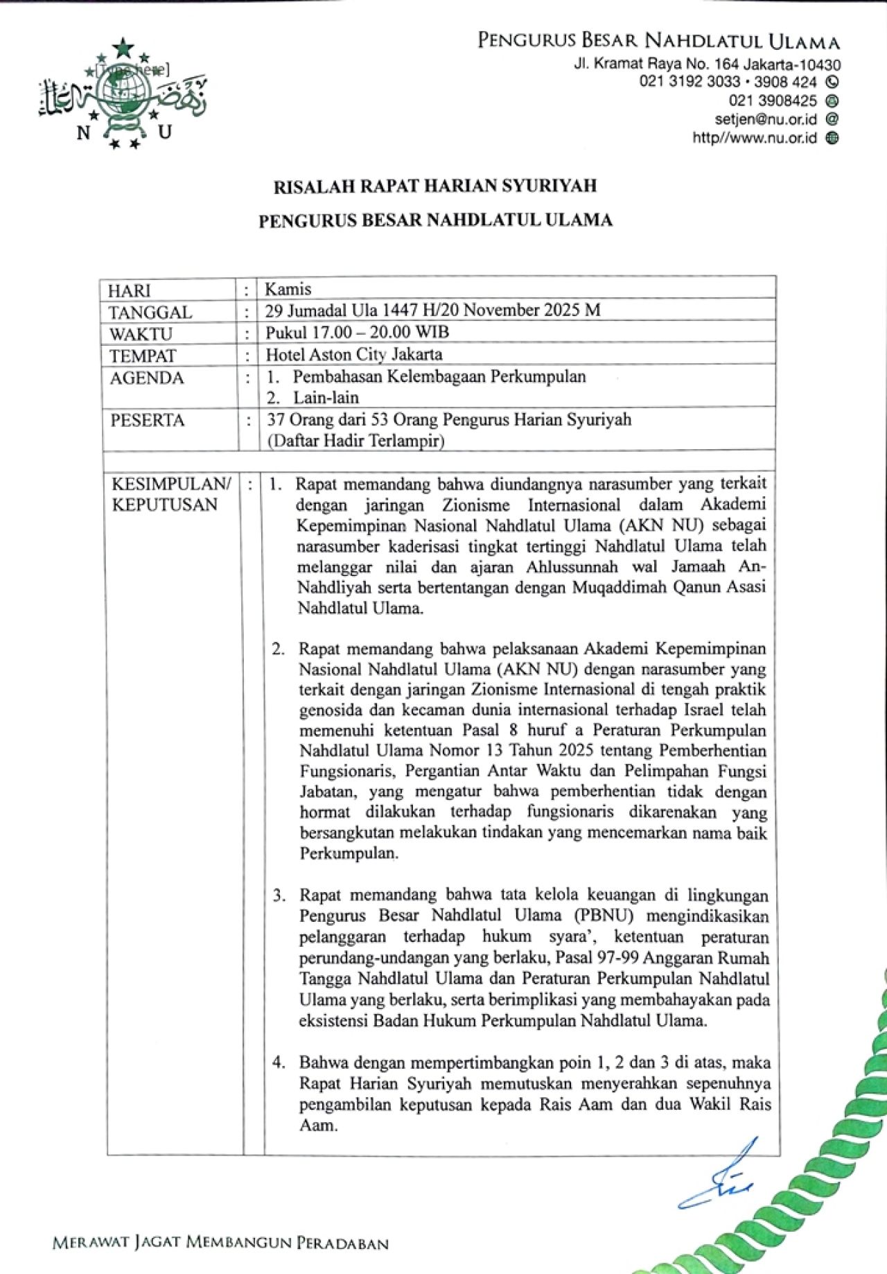Ini isi risalah lengkap Rapat Harian Syuriyah PBNU pada Kamis, 20 November 2025 yang ditandatangani Rais Aam KH Miftachul Akhyar.