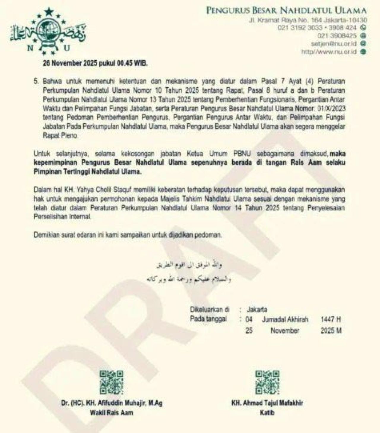 Menindaklanjuti hasil keputusan Rapat Harian Syuriyah Pengurus Besar Nahdlatul Ulama (PBNU) pada tanggal 29 Jumadal Ula 1447 H/20 November 2025 M di Jakarta sebagaimana Risalah Rapat terlampir, serta berdasarkan ketentuan Anggaran Dasar, Anggaran Rumah Tangga, dan Peraturan Perkumpulan Nahdlatul Ulama yang berlaku, serta Peraturan Pengurus Besar Nahdlatul Ulama Nomor 01/X/2023 tentang Pedoman Pemberhentian Pengurus, Pergantian Pengurus Antar Waktu, dan Pelimpahan Fungsi Jabatan Pada Perkumpulan Nahdlatul Ulama, melalui surat ini kami sampaikan beberapa hal sebagai berikut: