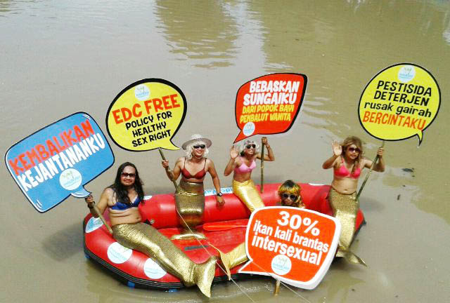SITUASI ini membuat gerah para aktivis lingkungan yang tergabung dalam Indonesia Water Community Of Practice (IndoWater CoP), yang Rabu (8/3) hari ini turun ke jalan -- bahkan melakukan aksi di sungai dengan dandanan ala Putri Duyung -- untuk mengkampanyekan perlindungan terhadap Kali Suroboyo.Riska Darmawanti, koordinator aksi mengatakan, Pemkot Surabaya sejauh ini hanya fokus melakukan penataan lingkungan sekitar sungai tetapi kurang perhatian terhadap pencemaran yang masih di lakukan oleh masyarakat Surabaya.