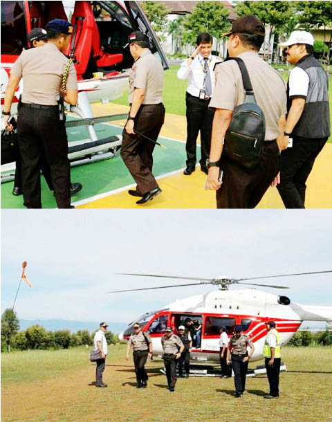 NAIK HELIKOPTER: Wakil Gubernur Jatim, Saifullah Yusuf mengunjungi longsor di Dusun Tingkil, Desa Banaran, Kecamatan Pulung, Kabupaten Ponorogo naik helikopter bersama rombongan Kapolda Jatim. | Foto: Ist