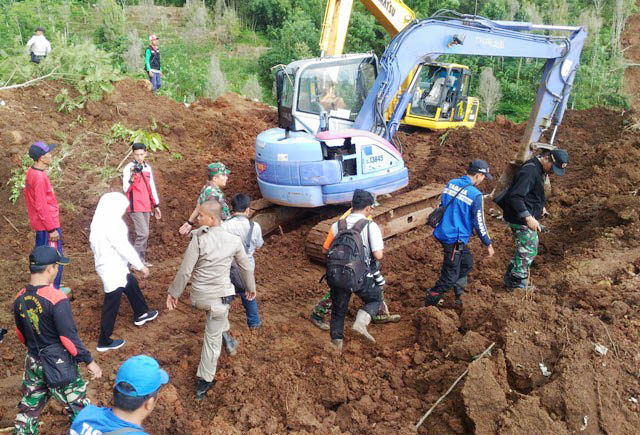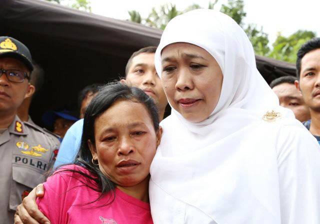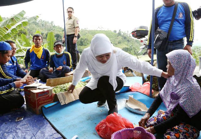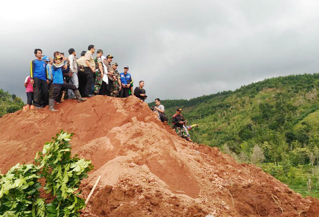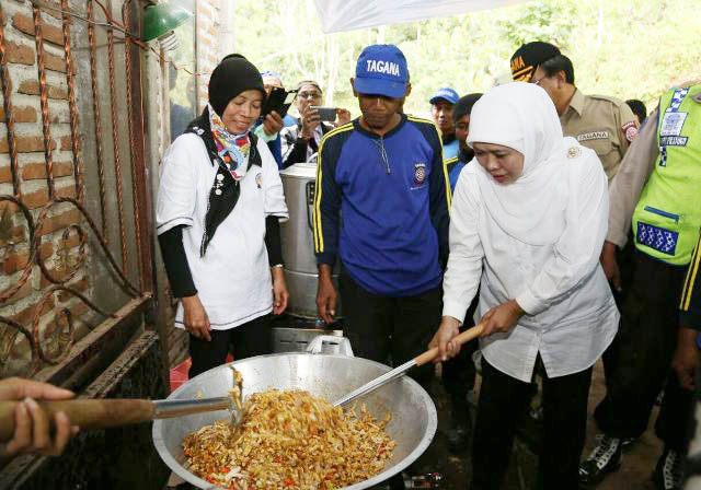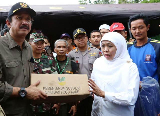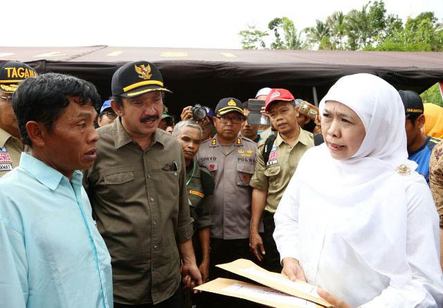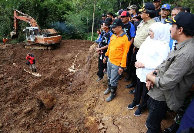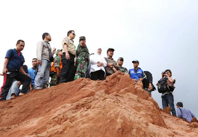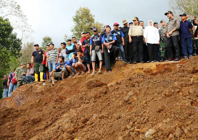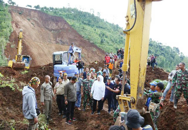 MENTERI SOSIAL Khofifah Indar Parawansa, pejabat pusat pertama yang mengunjungi lokasi dan korban longsor di Dusun Tingkil, Desa Banaran, Kecamatan Pulung, Kabupaten Ponorogo, Minggu (2/4). Datang dengan naik sepeda motor, bersepatu kets, turut merasakan duka mendalam sekaligus memberikan bantuan.