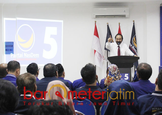 Surya Paloh di kantor Bappilu Nadsem Jatim di Surabaya, Sabtu (9/2/2019). | Foto: Barometerjatim.com/roy hs