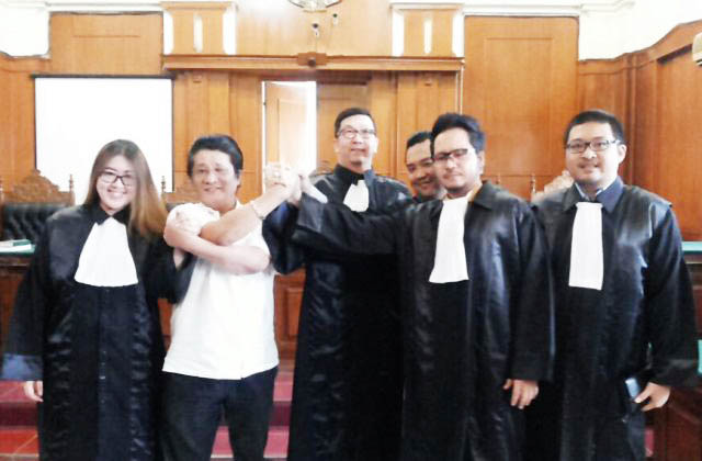 TAK BERSALAH: Singky Soewadji bersama kuasa hukumnya usai menjalani sidang.