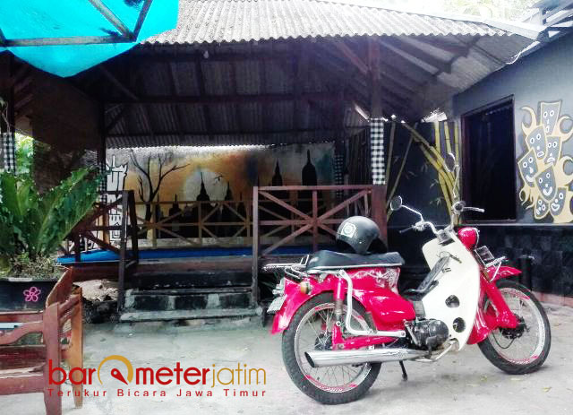 SILUET CANDI: Gazebo, tempat dimana pemilik rumah menerima tamu, kerabat, komunitas dan handai tolan dibuat suasana hening dengan nuansa gambar siluet candi. | Foto: Barometerjatim.com/ROY HASIBUAN