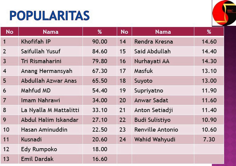 TAK POPULER: Hasil survei Surabaya Survey Center (SSC) periode Juni 2017, nama Nurwiyatno tak ada di kategori popularitas dari 24 kandidat yang muncul. | Grafis: Survei SSC
