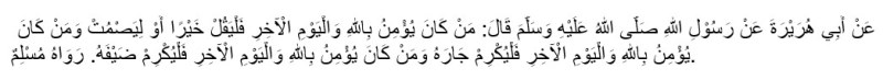 Dari Abu Hurairah ra dari Rasulullah Saw beliau bersabda, Barang siapa beriman kepada Allah dan hari akhir, maka hendaklah ia berkata yang baik atau diam. Barang siapa beriman kepada Allah dan hari akhir, maka hendaklah ia memuliakan tetangganya. Dan barang siapa yang beriman kepada Allah dan hari akhir, maka hendaklah ia memuliakan tamunya.