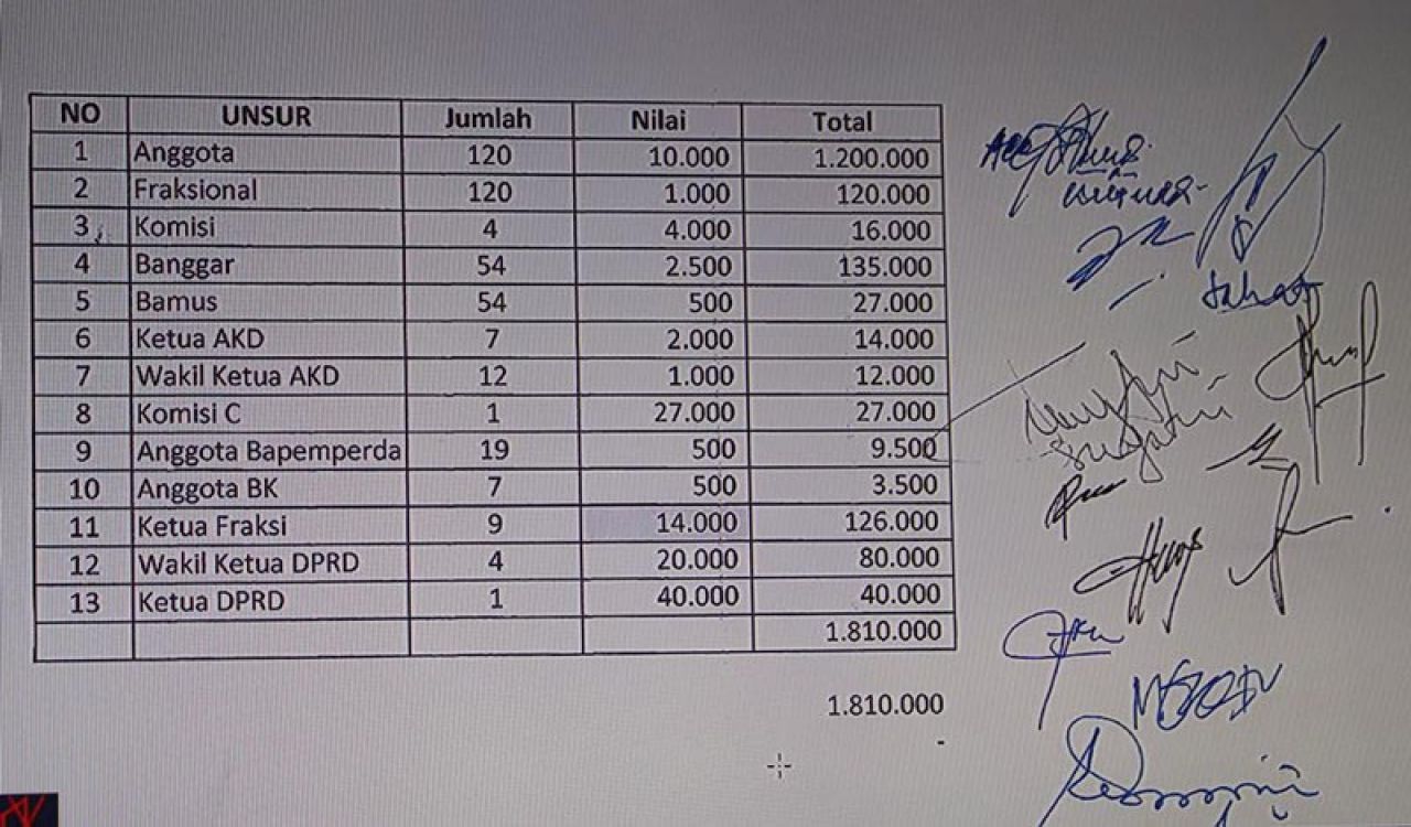 Ada 13 unsur yang mendapat jatah, yakni masing-masing anggota Rp 10 miliar atau 1,2 triliun untuk total 120 anggota. Lalu fraksional Rp 1 miliar (jumlah 120 orang/total Rp 120 miliar), komisi Rp 4 miliar (4/Rp 16 miliar), Banggar Rp 2,5 miliar (54/Rp 135 miliar), dan Bamus Rp 500 juta (54/Rp 27 miliar).