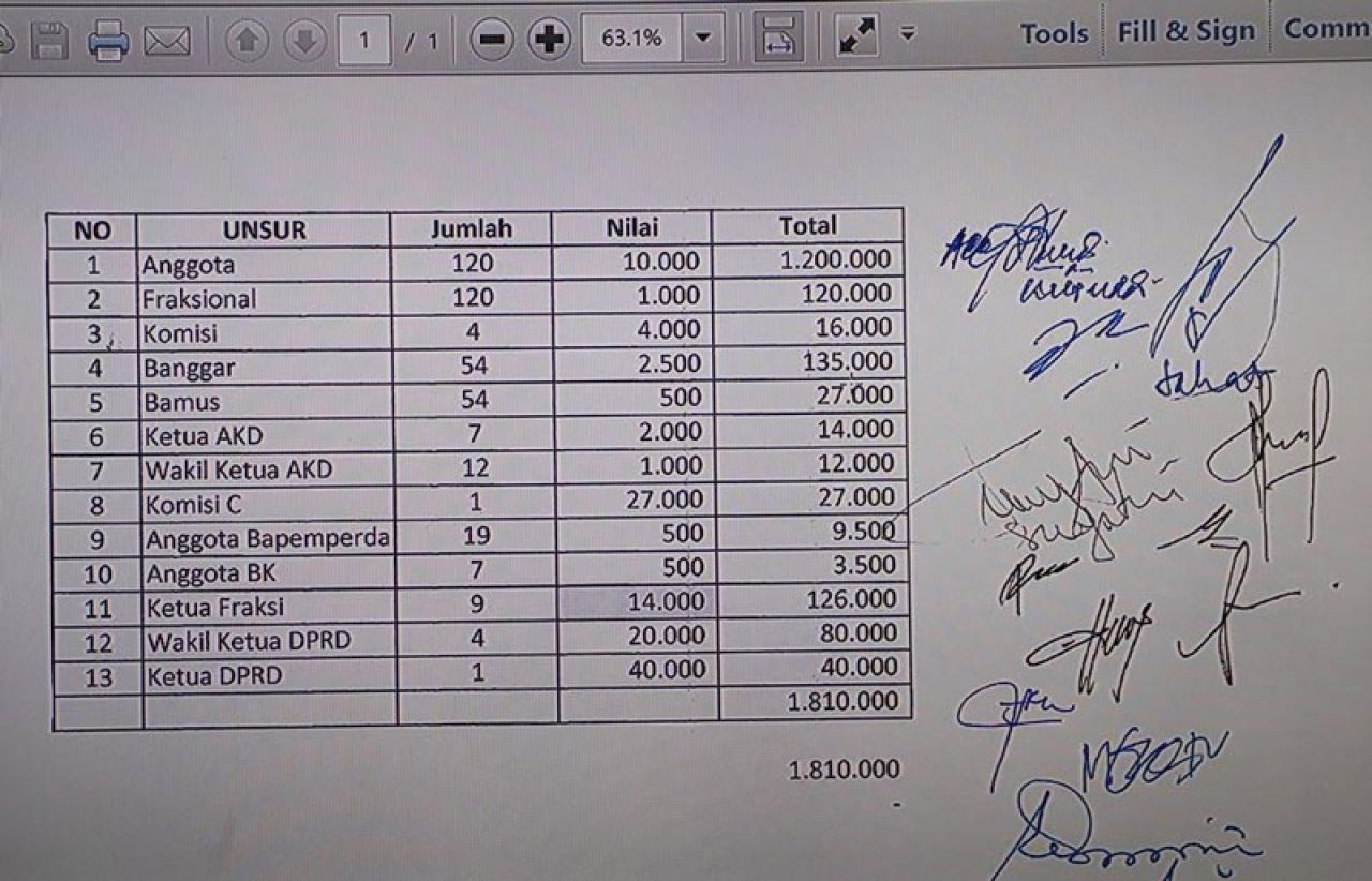Yakni masing-masing anggota Rp 10 miliar atau 1,2 triliun untuk total 120 anggota. fraksional Rp 1 miliar (jumlah 120 orang/total Rp 120 miliar), komisi Rp 4 miliar (4/Rp 16 miliar), Banggar Rp 2,5 miliar (54/Rp 135 miliar), dan Bamus Rp 500 juta (54/Rp 27 miliar).