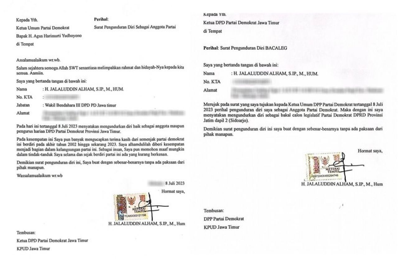 Kedua, surat pernyataan pengunduran diri sebagai Bacaleg yang ditujukan kepada Ketua DPD Partai Demokrat Jatim, Emil Elestianto Dardak. Jalal menyatakan mengundurkan diri sebagai Bacaleg Demokrat untuk DPRD Jatim dari Daerah Pemilihan (Dapil) Jatim II (Kabupaten Sidoarjo).