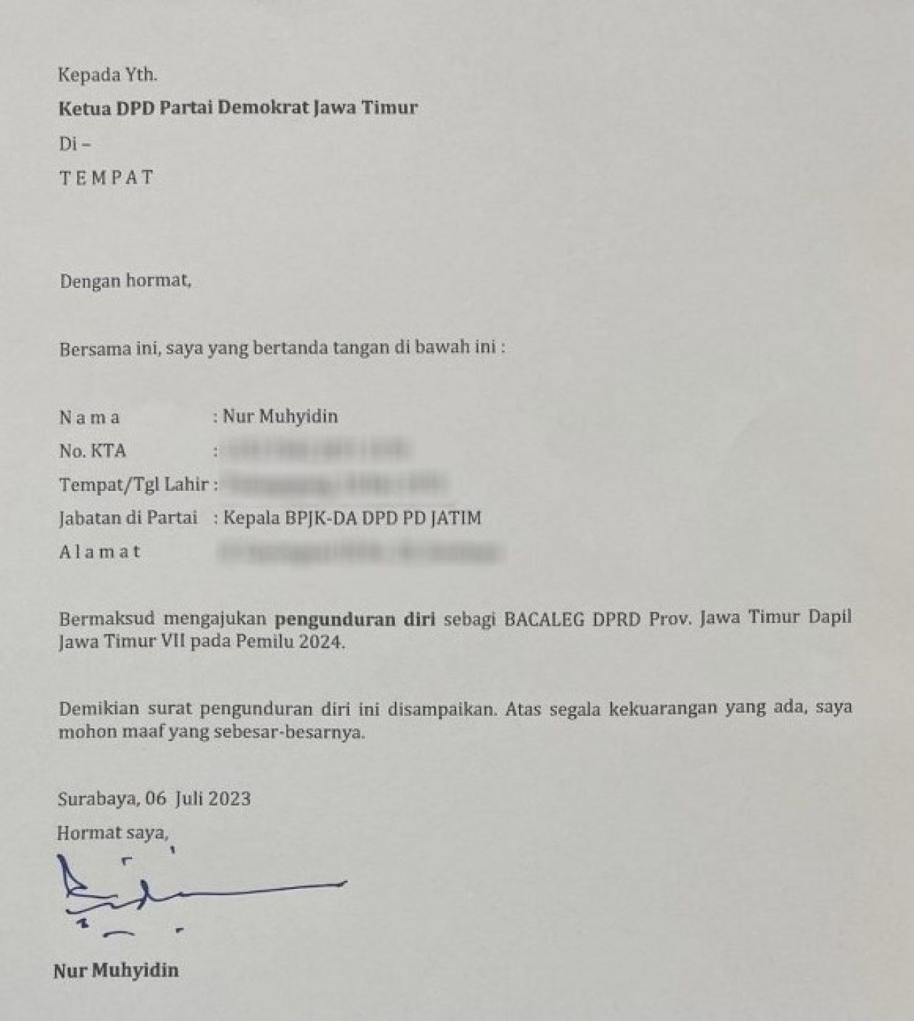 LEBIH DULU MUNDUR: Surat pengunduran diri Nur Muhyidin dari Bacaleg Demokrat Jatim. | Foto: IST