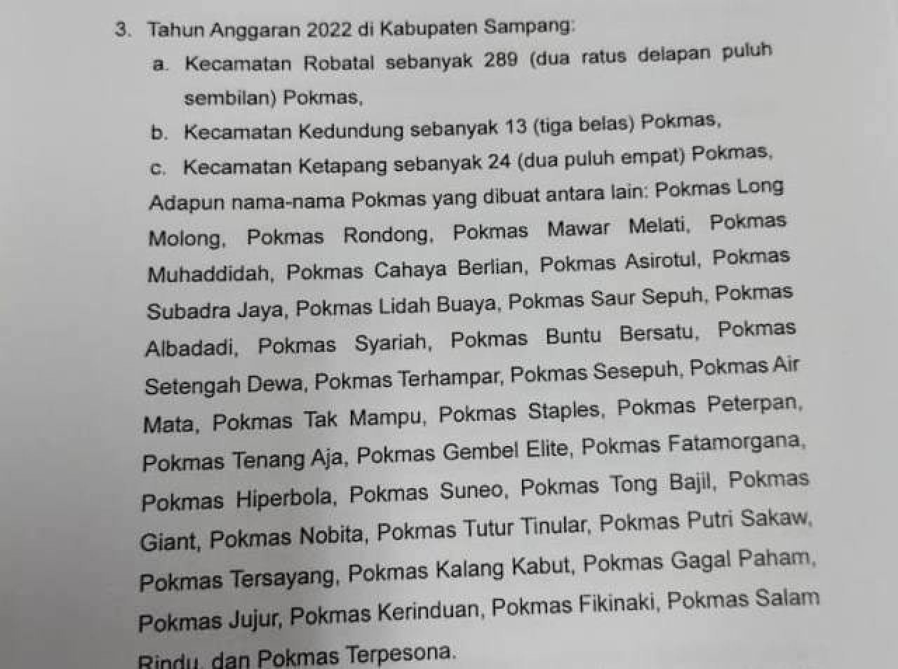 Kemudian di TA 2022 terdapat 326 Pokmas, tersebar di Kecamatan Robatal (289), Kedundung (13), dan Ketapang 24. Nama-nama Pokmasnya antara lain Mawar Melati, Lidah Buaya, Saur Sepuh, Syariah, Buntu Bersatu, Setengah Dewa, Terhampar, Sesepuh, dan Tenang Aja.