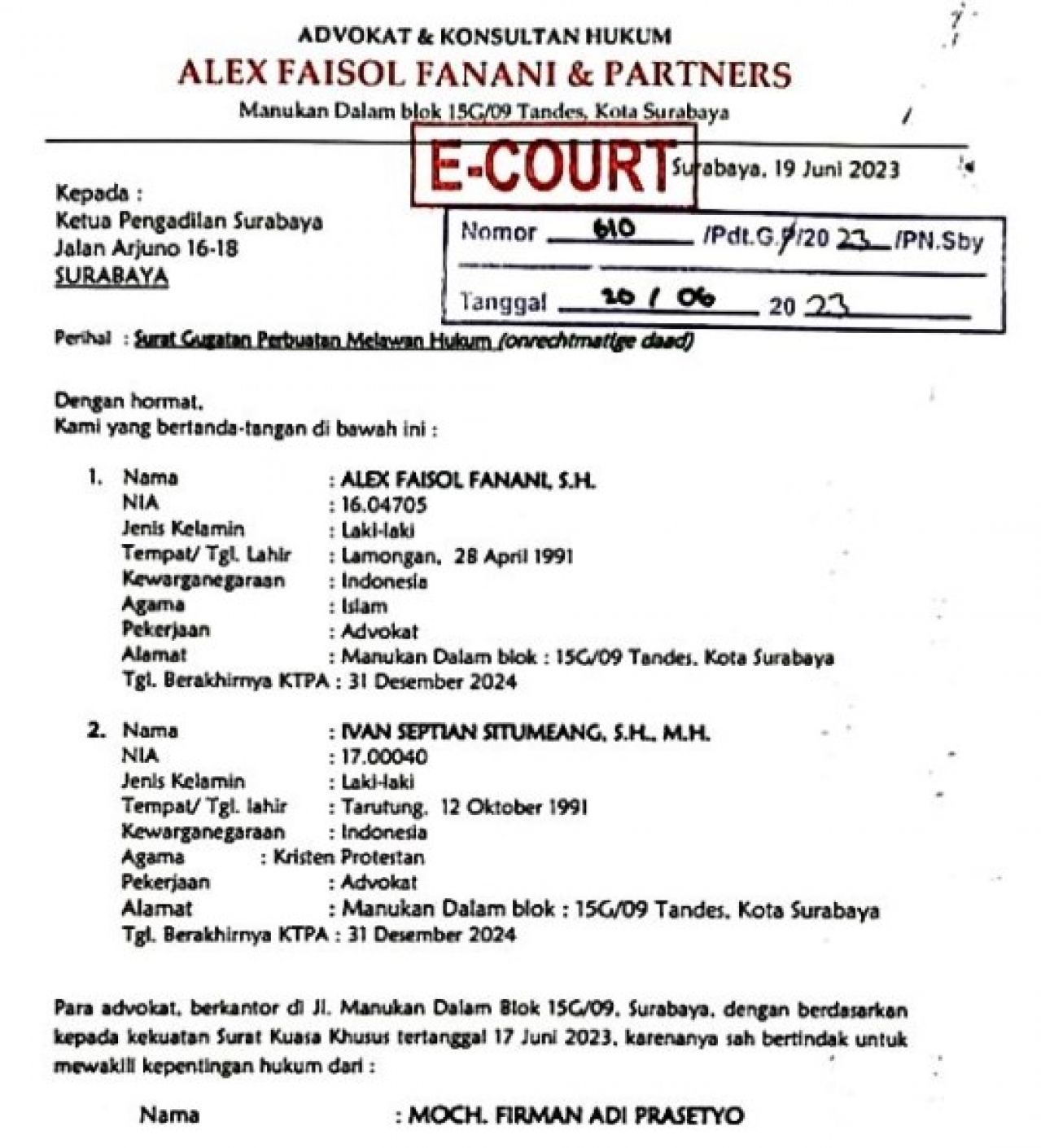 Sementara itu Alex Faisol Fanani & Partners dalam suratnya yang ditujukan kepada Ketua PN Surabaya tanggal 19 Juni 2023 perihal surat gugatan perbuatan melawan hukum menyebut, Dwi Budi Sulistyana tidak memiliki dasar pengetahuan dan pengalaman memadai di bidang usaha perusahaan dalam hal ini PT PJU.