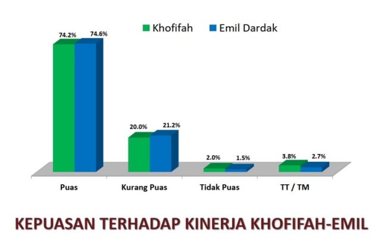 Dalam survei yang mengambil 1.200 sebagai responden dengan metode stratified multistage random sampling tersebut, sebanyak 74,6% responden menyatakan puas dengan kinerja Emil dan 74,2% untuk Khofifah.