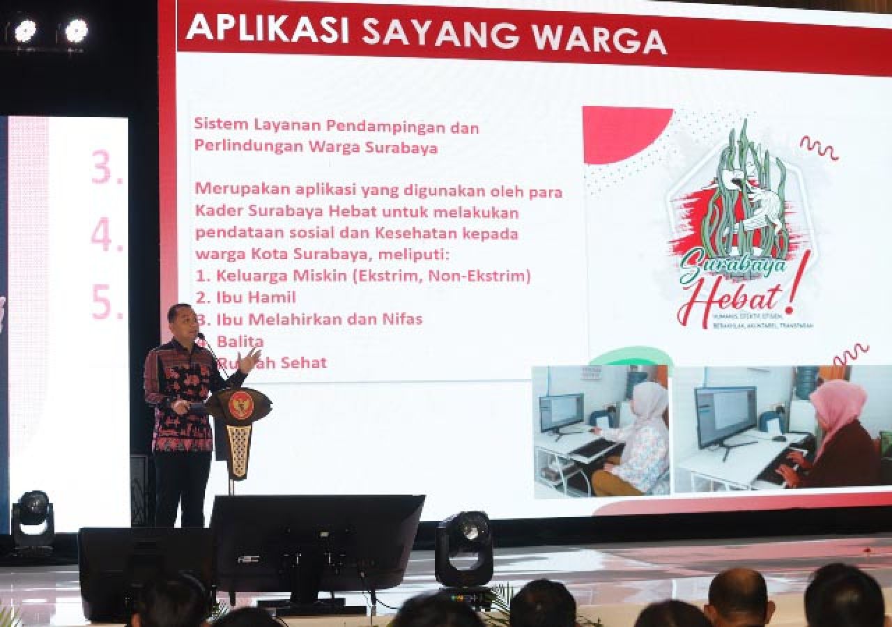 “Jadi, semua pelayanan di Surabaya sudah kita lakukan dengan berbasis elektronik, mulai dari perencanaan, perizinan dan semuanya sudah kita lakukan dengan elektronik,” kata Wali Kota Eri di depan ratusan kepala daerah dan disaksikan oleh jajaran Kemenkominfo RI.