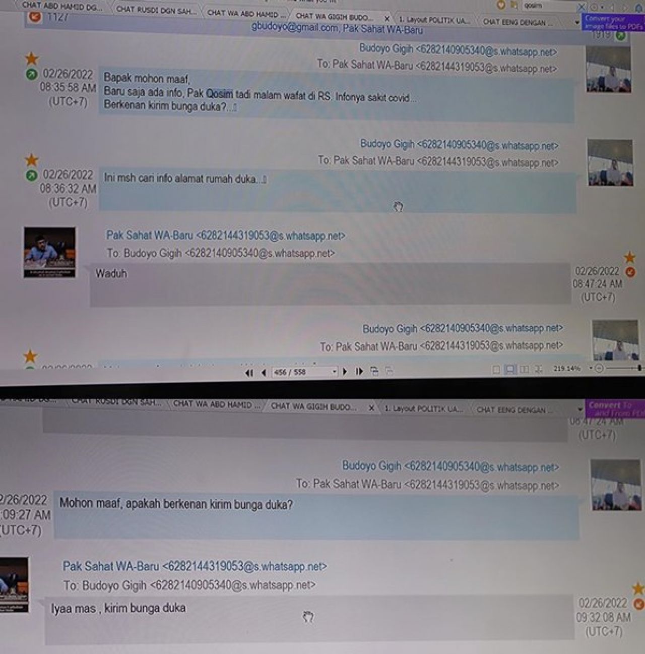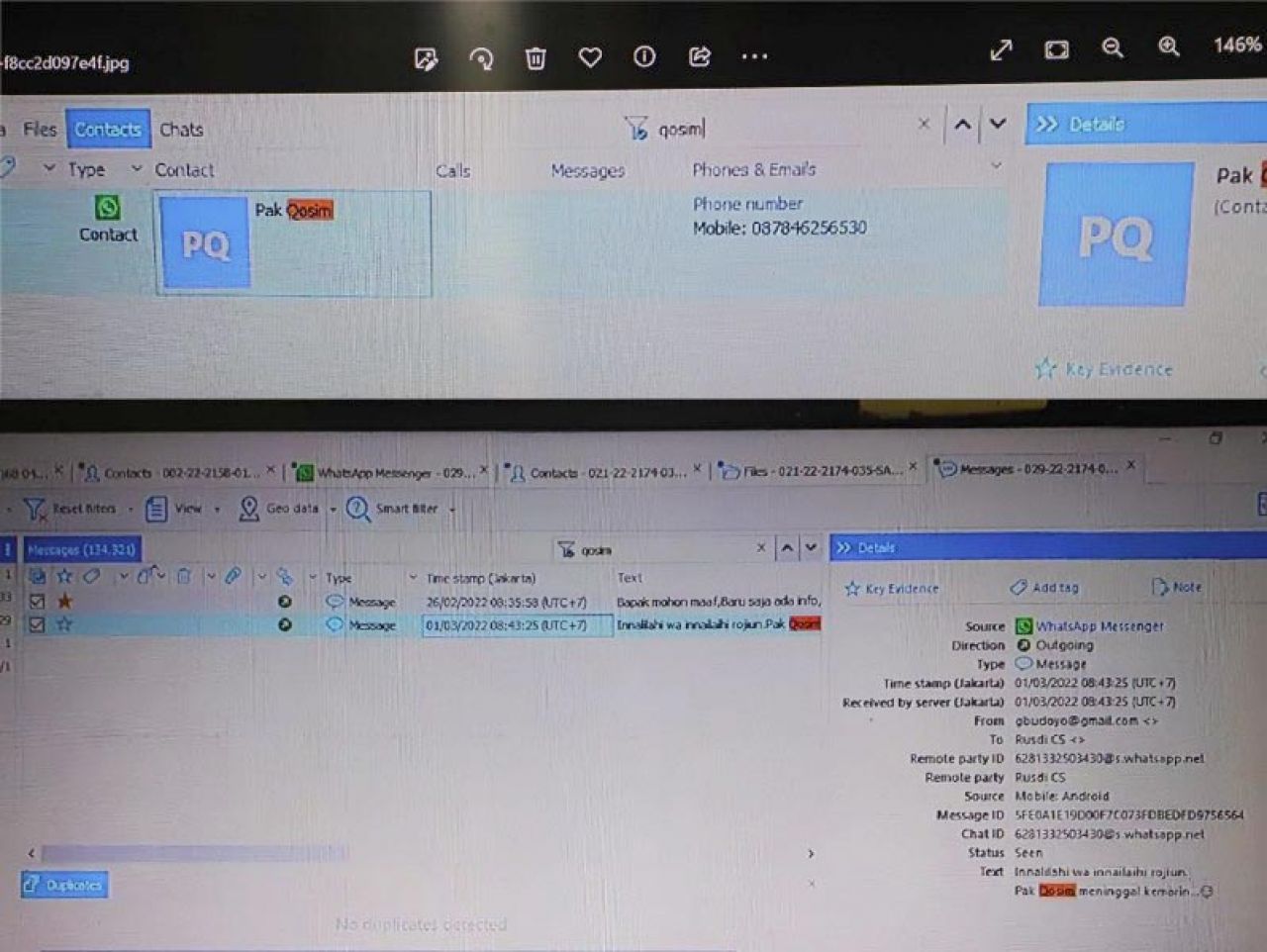 KPK kemudian untuk kali kesekian menunjukkan bukti yang tersimpan di HP Gigih, tertera pada 3 Maret 2023 dia menyampaikan ke Rusdi lewat chat WA yang berbunyi: Inna lillahi wa inna ilaihi raji'un, Pak Qosim meninggal kemarin.