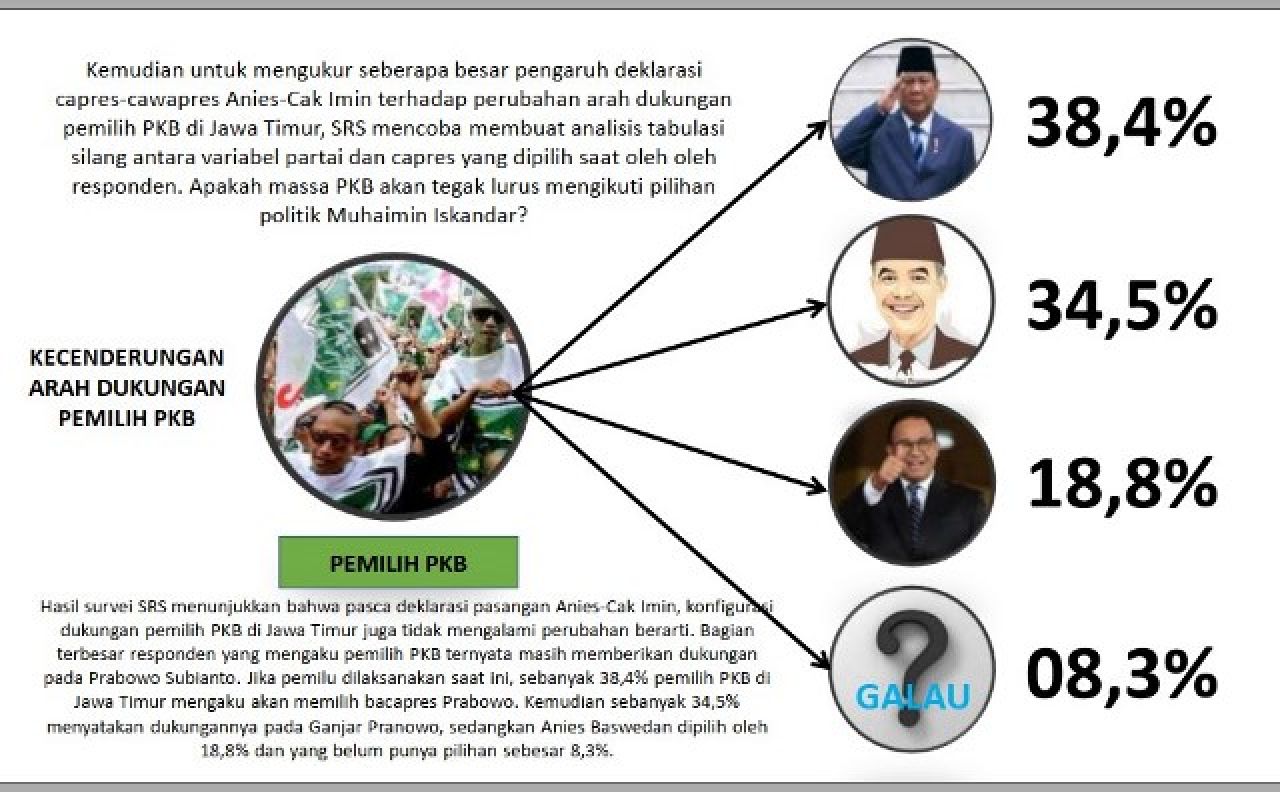 SURABAYA, Barometer Jatim – Pasca Ketua Umum Partai Kebangkitan Bangsa (PKB) Muhaimin Iskandar alias Cak Imin deklarasi Cawapres mendampingi Anies Baswedan, ternyata tak otomatis mendapat aliran suara pemilih PKB dan warga Nahdlatul Ulama (NU). Justru sebaliknya, mayoritas 'suara hijau' malah mengalir ke Prabowo Subianto.