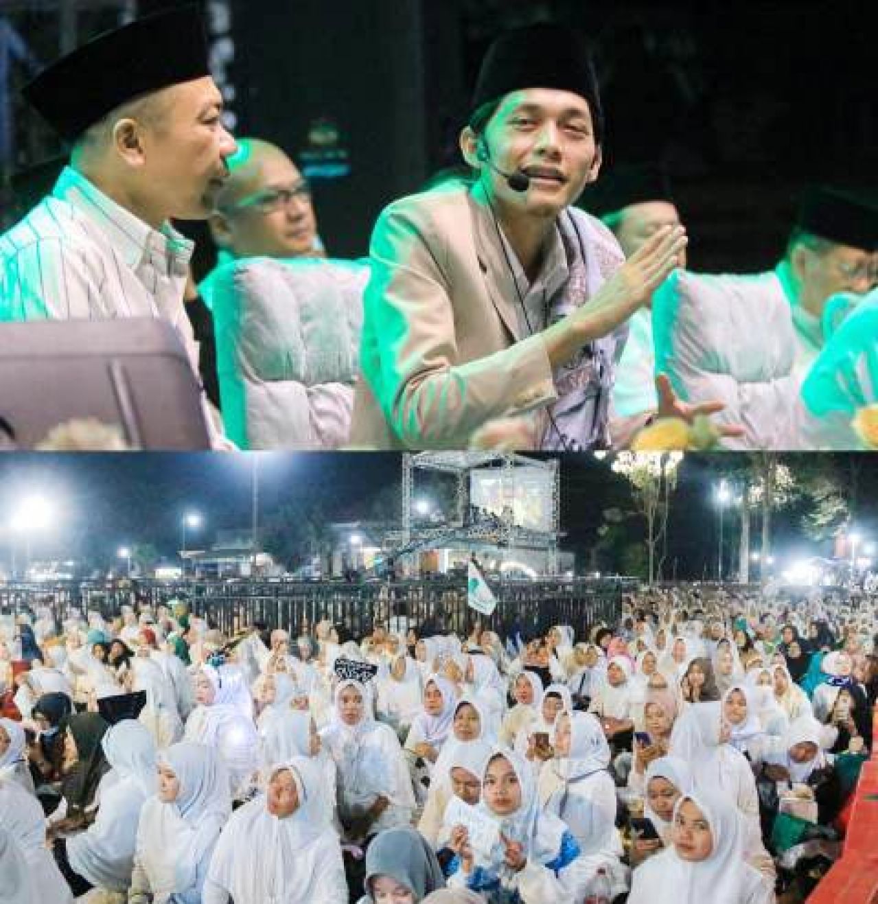 LAUTAN JAMAAH: Rahmat Santoso, Gus Iqdam, dan lautan jamaah pengajian di Blitar. | Foto: Barometerjatim.com/TOMMY