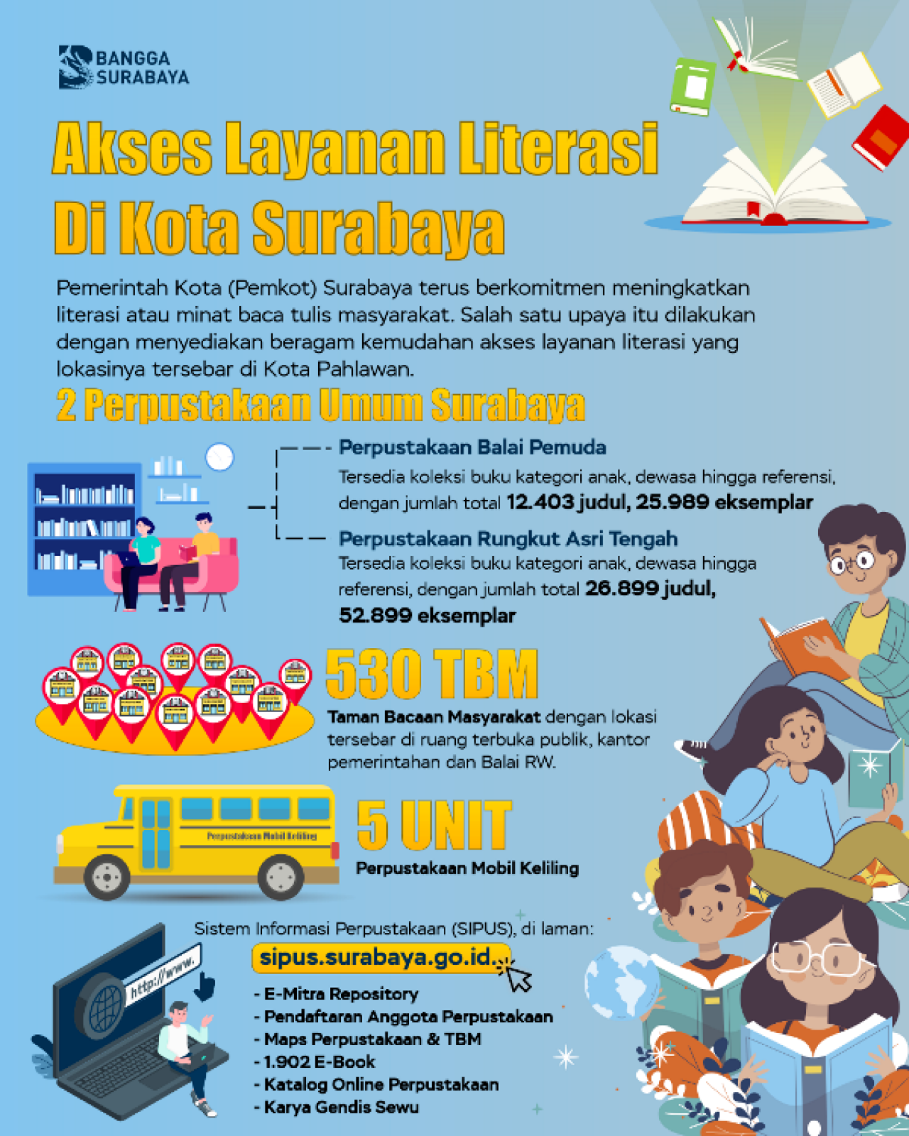 "Selain menyediakan perpustakaan dan TBM dengan lokasi menetap, Pemkot Surabaya juga memiliki 5 perpustakaan mobil keliling," kata Sekretaris Dinas Perpustakaan dan Kearsipan (Dispusip) Kota Surabaya, Novelija.
