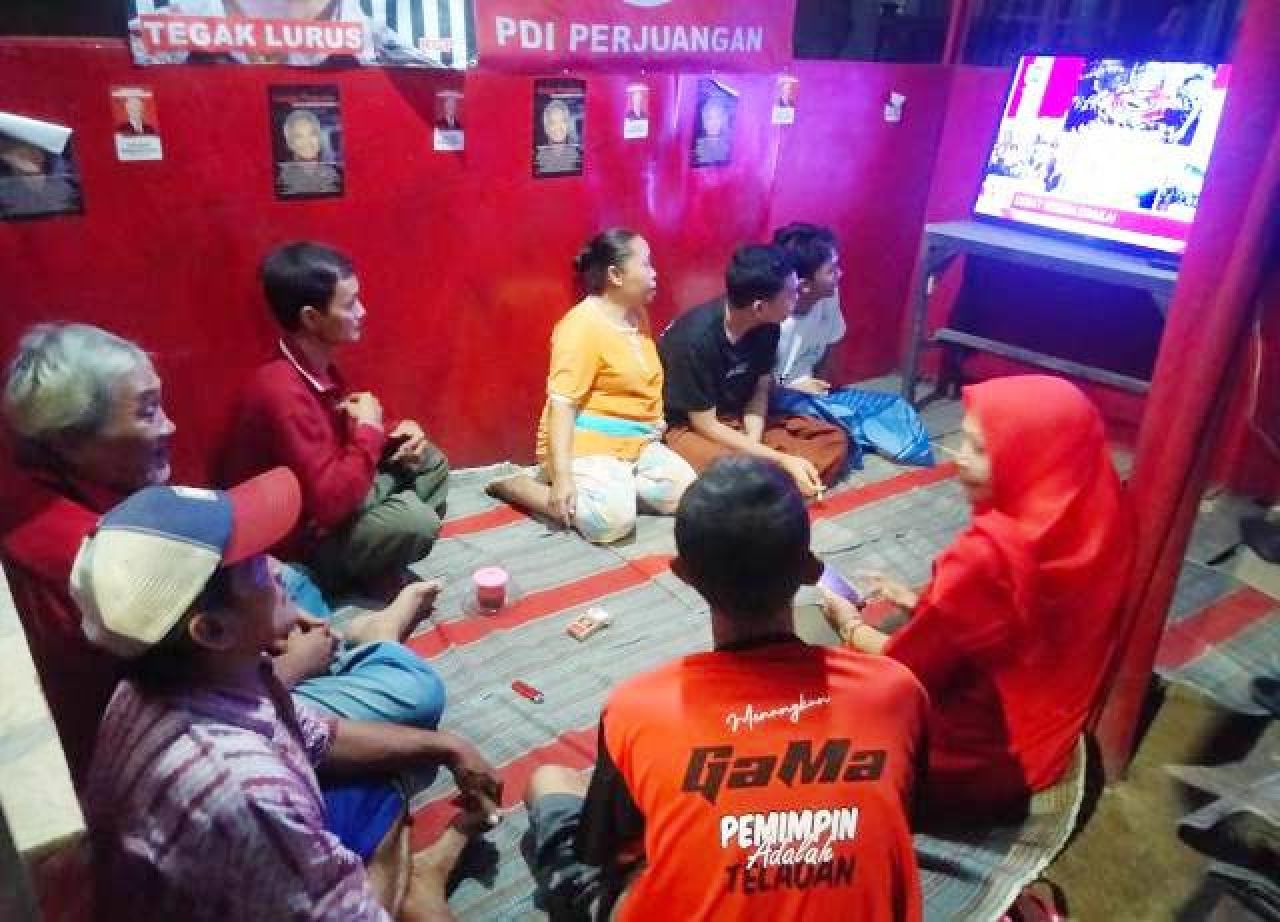 Di Posko Ganjar-Mahfud di kawasan Gununganyar Tambak, Caleg PDIP nomor 2 Reksa Ningsih menggelar nobar bersama para tokoh kampung, kader banteng, relawan dan warga masyarakat.