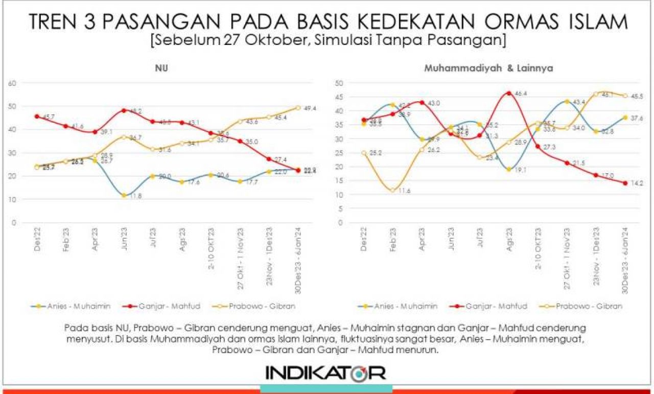 Berbeda terbalik dengan tre yang dialami pasangan Ganjar Pranowo-Mahfud MD. Dukungan dari kelompok pemilih NU yang semula 35% kali ini justru menurun menjadi 27,4%.