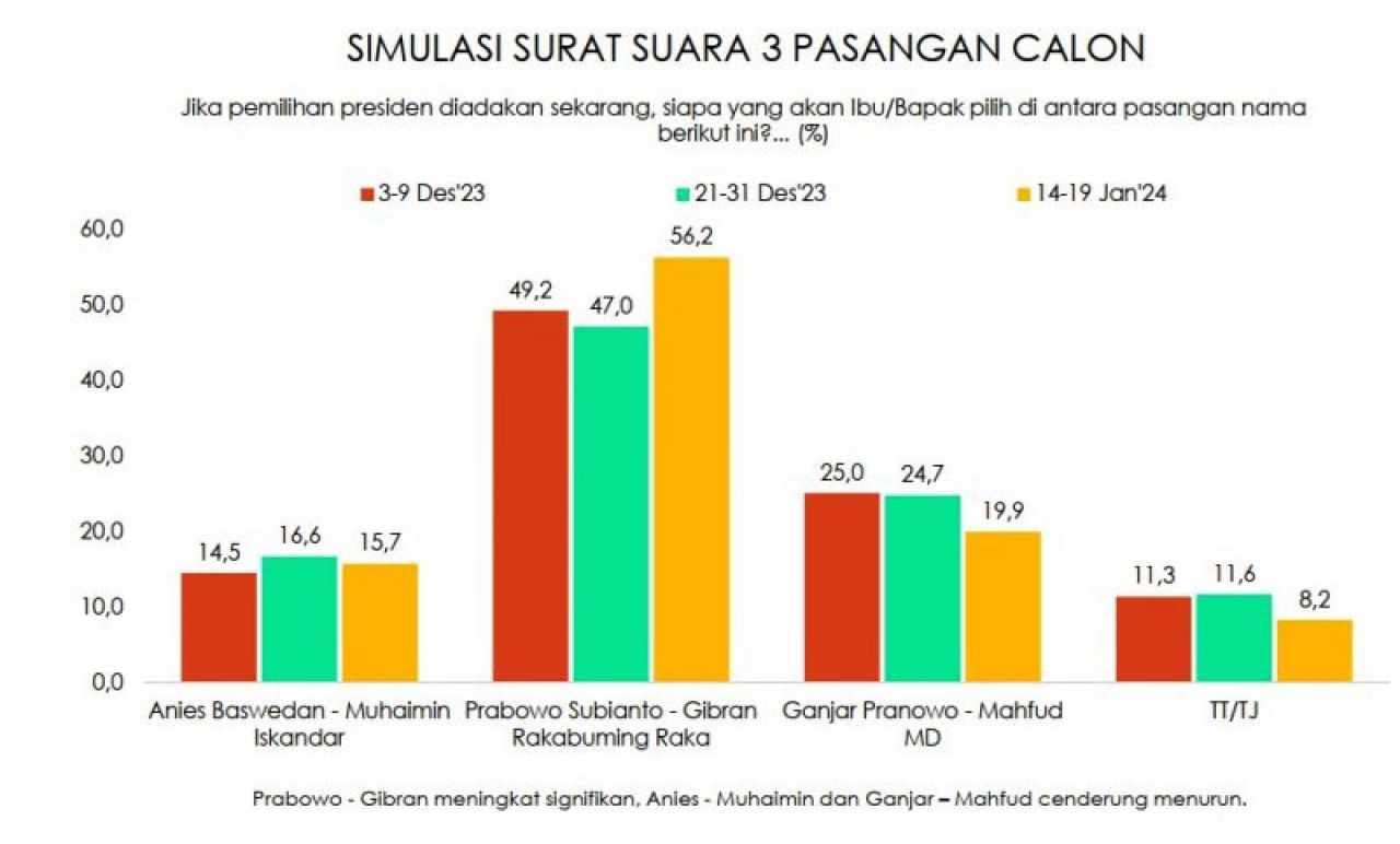 SURABAYA | Barometer Jatim – Elektabilitas Prabowo Subianto-Gibran Rakabuming Raka melesat tajam di Jawa Timur, bahkan menembus 56,2Úlam survei yang digelar Indikator Politik Indonesia pada 14-19 Januari 2024.