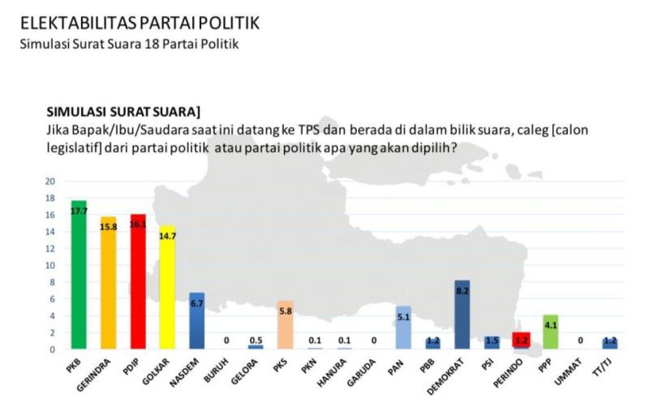 Dalam survei tersebut, terang Baihaki, elektabilitas PKB di angka 17,7�n berada di peringkat teratas. Menguntit di peringkat kedua ada PDIP di angka 16,1%. Sedangkan Gerindra di posisi ketiga di angka 15,8%, dan Golkar 14,7% melengkapi 4 besar.