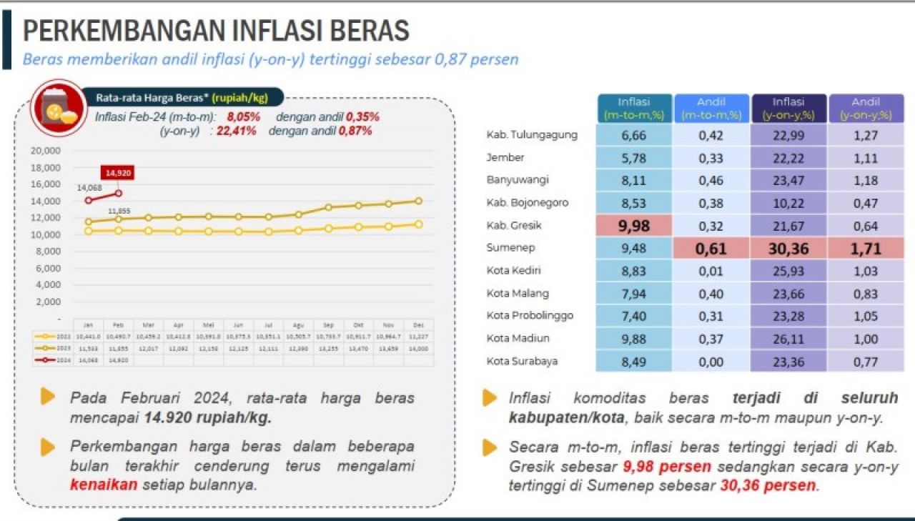 Khusus inflasi beras, papar Zulkipli, dari 11 kabupaten/kota IHK sepanjang Februari 2024 inflasi beras tertinggi terjadi di Kabupaten Gresik sebesar 9,98%.