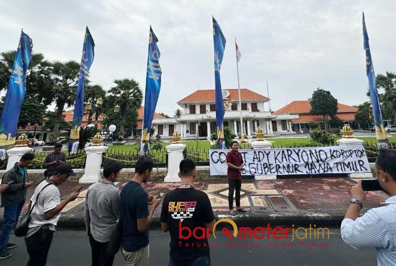 Di depan Gedung Negara Grahadi Surabaya, aktivis berorasi sambil membentangkan sejumlah spanduk, di antaranya bertuliskan: Copot Adhy Karyoni Koruptor Pj Gubernur Jawa Timur.