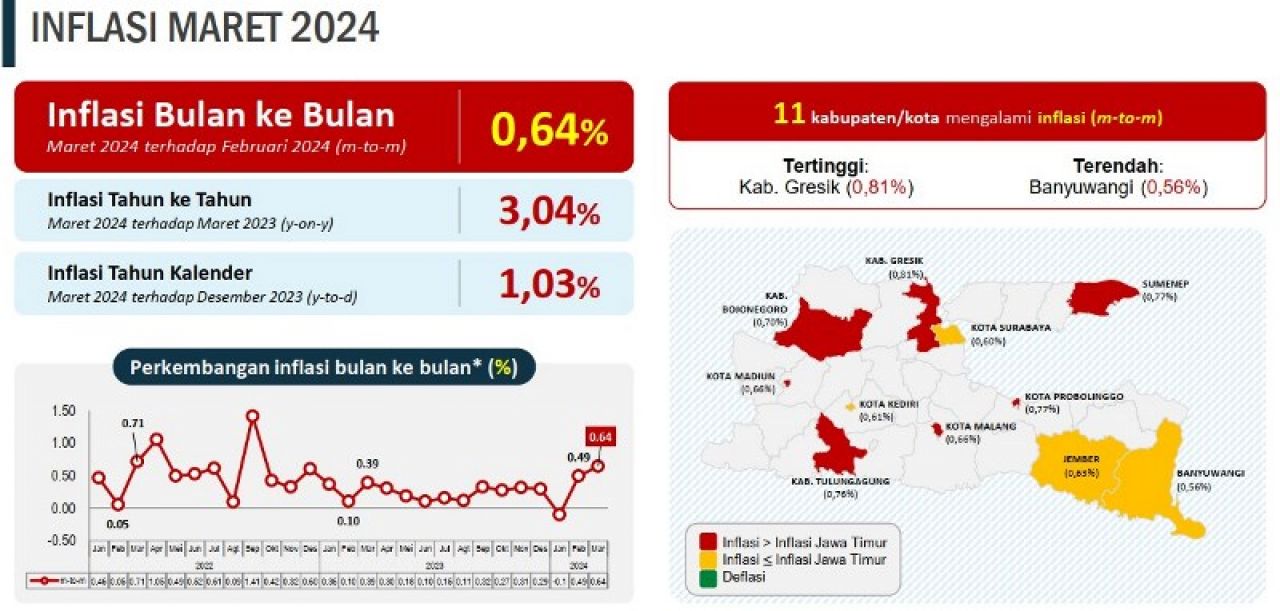 “Sedangkan tingkat inflasi month to month (m-to-m) dan tingkat inflasi year to date (y-to-d), Provinsi Jatim bulan Maret 2024 masing-masing sebesar 0,64Ún 1,03%,” katanya.