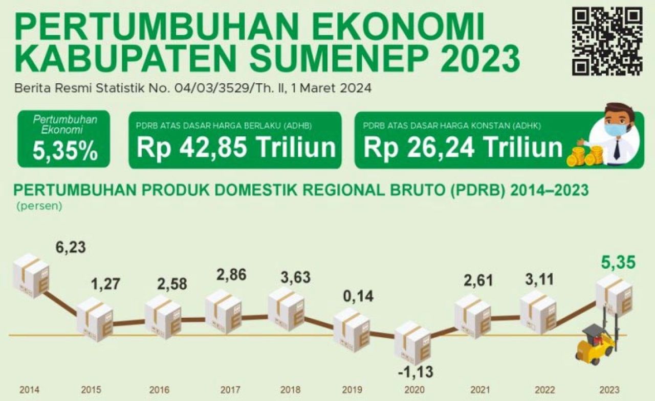 MELESAT: Pertumbuhan ekonomi Sumenep melesat 5,35% pada 2023 dari sebelumnya 3,11%. | Sumber Data: BPS Sumenep
