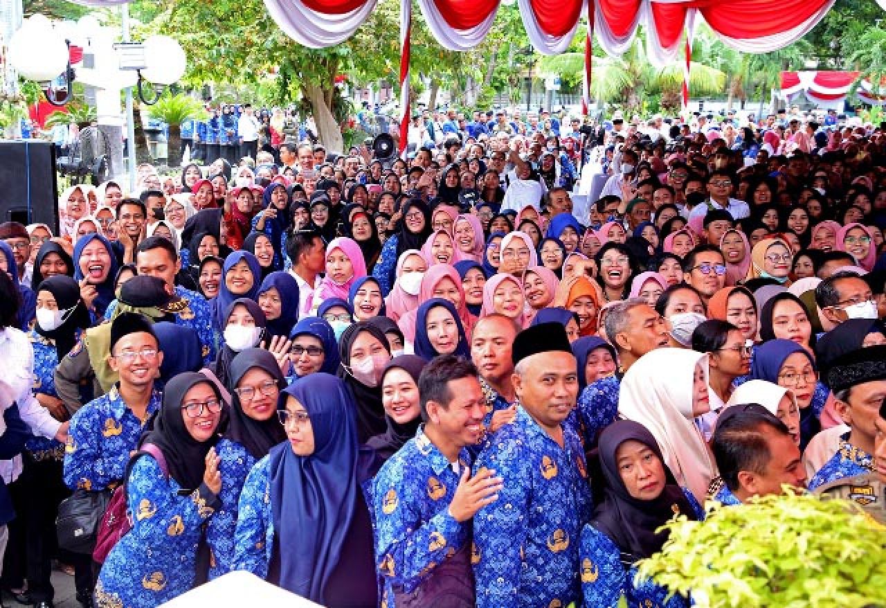 BERJUBEL: Puluhan ribu guru SD-SMP se-Surabaya padati halaman bali kota untuk halal bi halal. | Foto: Barometerjatim.com/HPS