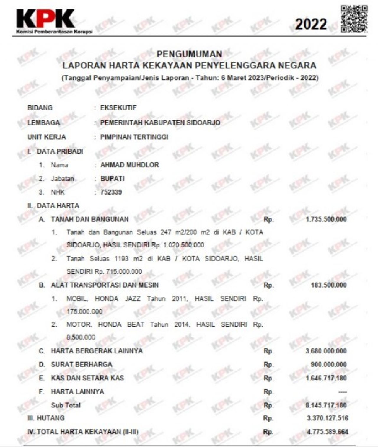 Tahun pertama menjabat, Muhdlor yang mengalahkan Bambang Haryo Soekartono (BHS) dan Kelana Aprilianto di Pilkada Sidoarjo 2020 melaporkan hartanya menjadi Rp 4,13 miliar (4.137.437.371) atau naik Rp 1,17 miliar (1.175.910.334).