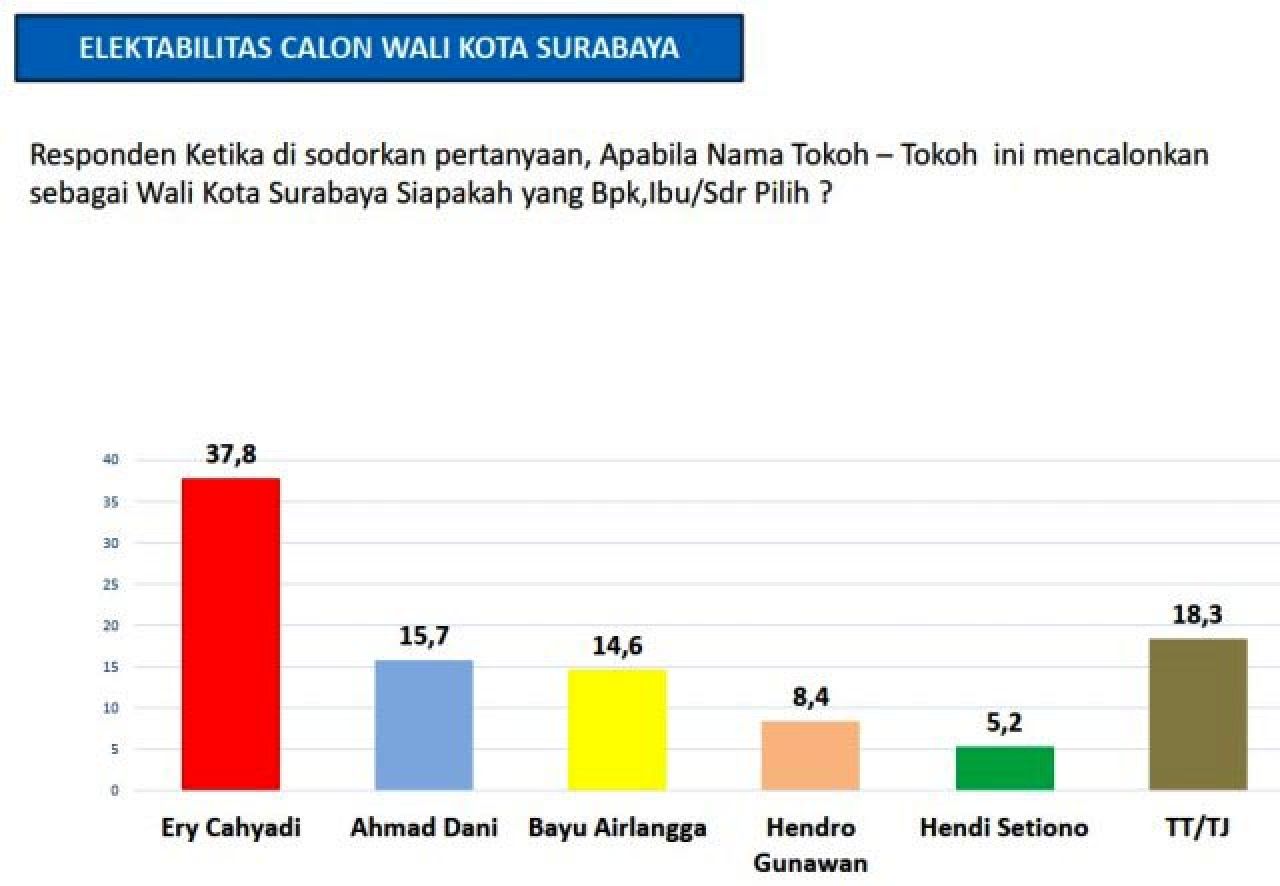 Sedangkan di trek calon Wakil Wali Kota, Armuji masih teratas dengan elektabilitas 35,8%, disusul Bayu Airlangga 25,5%, Hendy Setiono 13,1%, Hadi Dediansyah 8,7%, Arif Fathoni 3,2%, dan 13,7% lainnya belum menentukan pilihan.