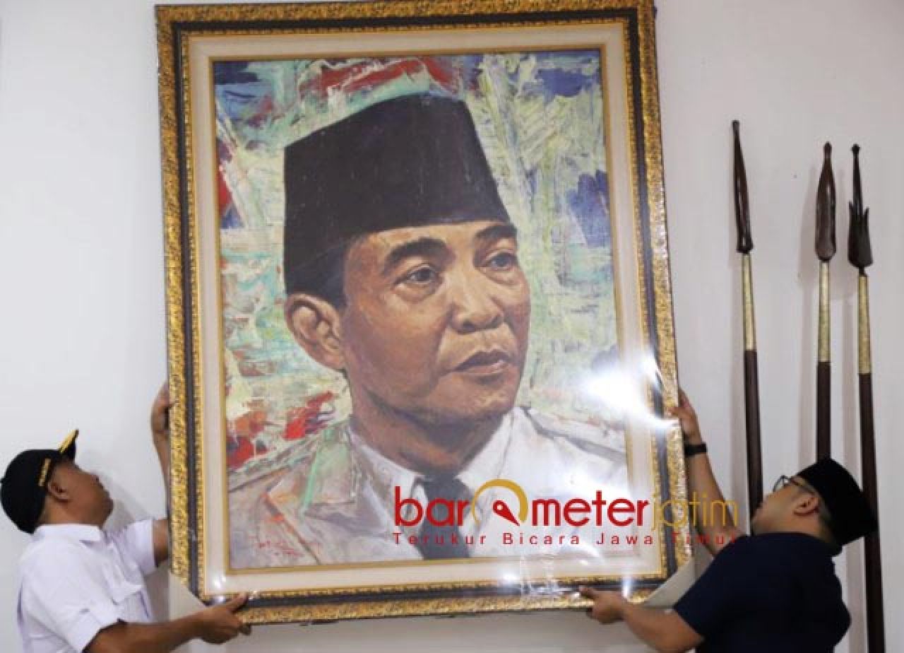 LANGSUNG DIPASANG: Lukisan bergambar Bung Karno dari PDIP Jatim langsung dipasang. | Foto: Barometerjatim.com/ROY