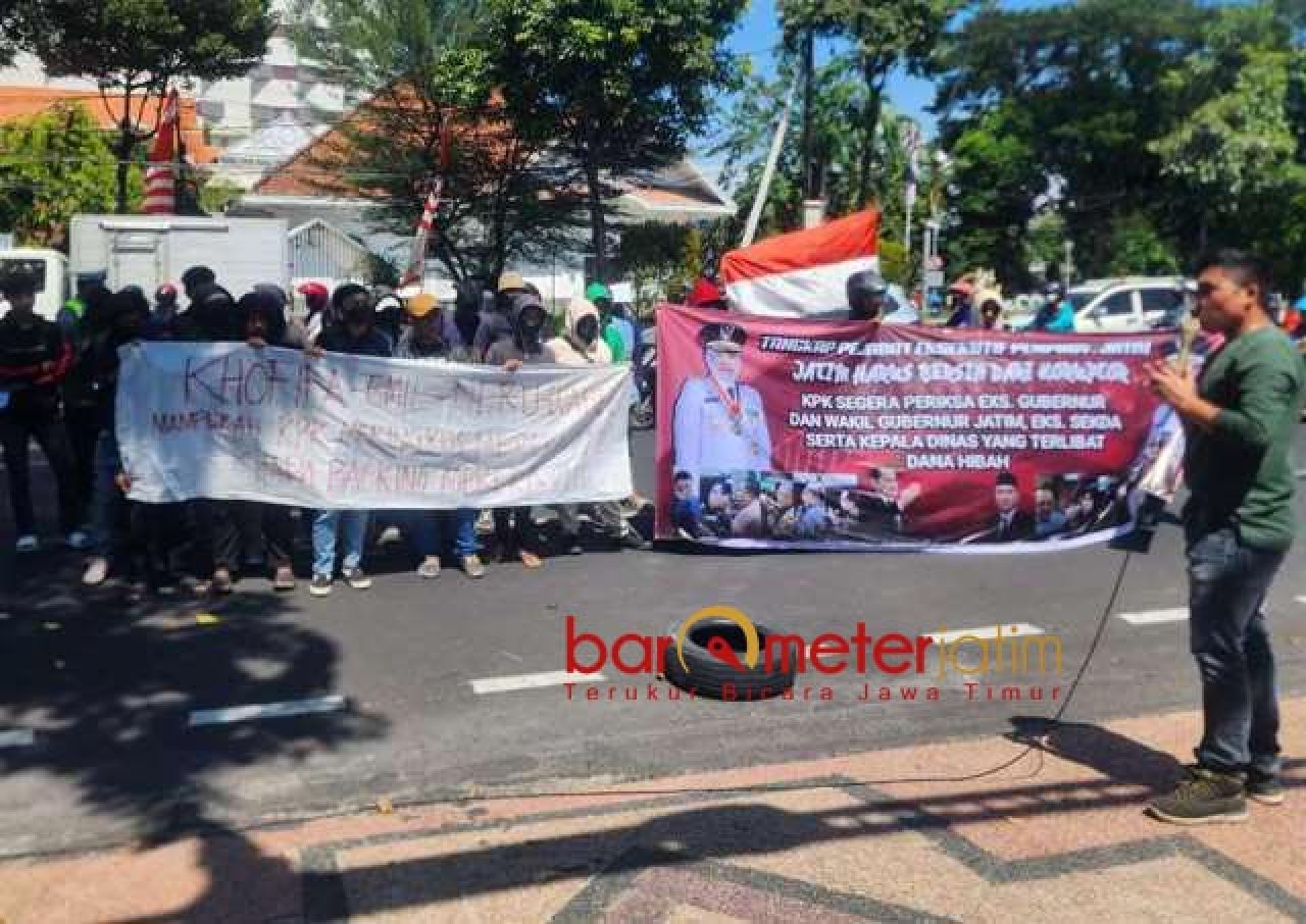 ADILI: Jaka Jatim bentangkan spanduk adili pejabat Pemprov Jatim dalam korupsi hibah. | Foto: Barometerjatim.com/ANDRIAN