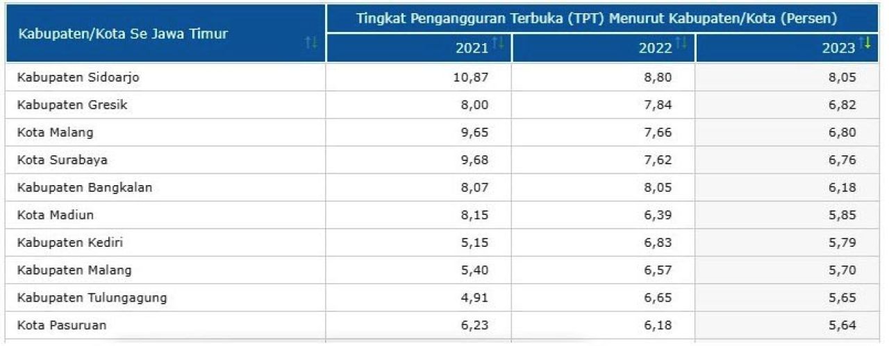 Menilik data BPS, Tingkat Pengangguran Terbuka (TPT) Kabupaten Sidoarjo pada 2023 tercatat tertinggi se-Jawa Timur yakni 8,05%. Dalam 10 besar, di bawahnya menyusul Kabupaten Gresik (6,82%), Kota Malang (6,80%), Kota Surabaya (6,76%), Kabupaten Bangkalan (6,18%), Kota Madiun (5,85%), Kabupaten Kediri (5,79%), Kabupaten Malang (5,70%), Kabupaten Tulungagung (5,65), dan Kota Pasuruan (5,64%).