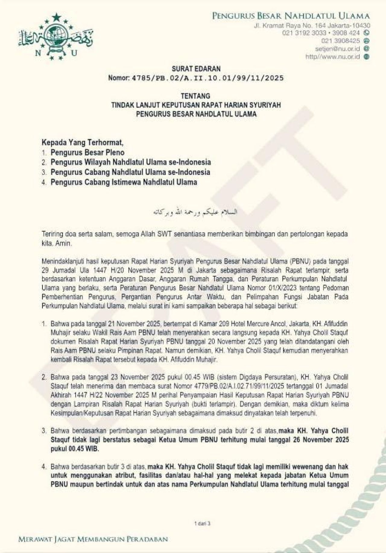 3. Bahwa berdasarkan pertimbangan sebagaimana dimaksud pada butir 2 di atas, maka KH. Yahya Cholil Staquf tidak lagi berstatus sebagai Ketua Umum PBNU terhitung mulai tanggal 26 November 2025 pukul 00.45 WIB.