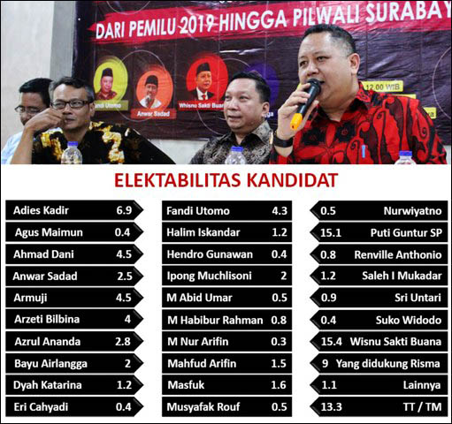 Dari hasil survei Surabaya Survey Center (SSC) yang dirilis di Hotel Yello, Rabu (9/1), petahana Whisnu Sakti Buana mencatat elektabilitas tertinggi: 15,4 persen.
